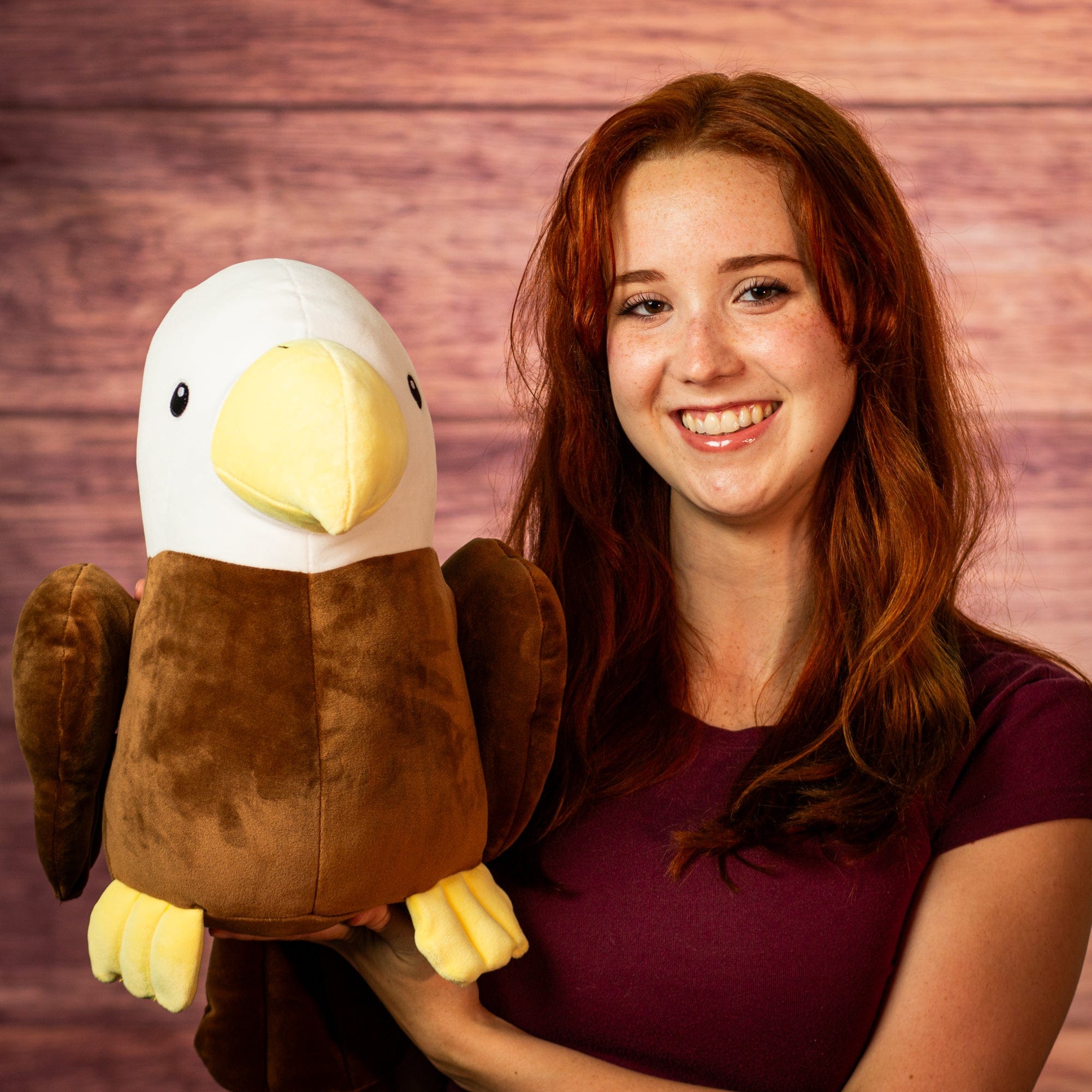 This 12" sitting plush bald eagle features a smooth white head, chocolate brown body, and oversized yellow beak and talons. Designed with a sleek, upright silhouette, it��s both patriotic and playful��ideal for gift shops, nature centers, or Fourth of July displays. With soft, velvety fabric and bold colors, this eagle adds a majestic touch to plush assortments and display shelves alike.