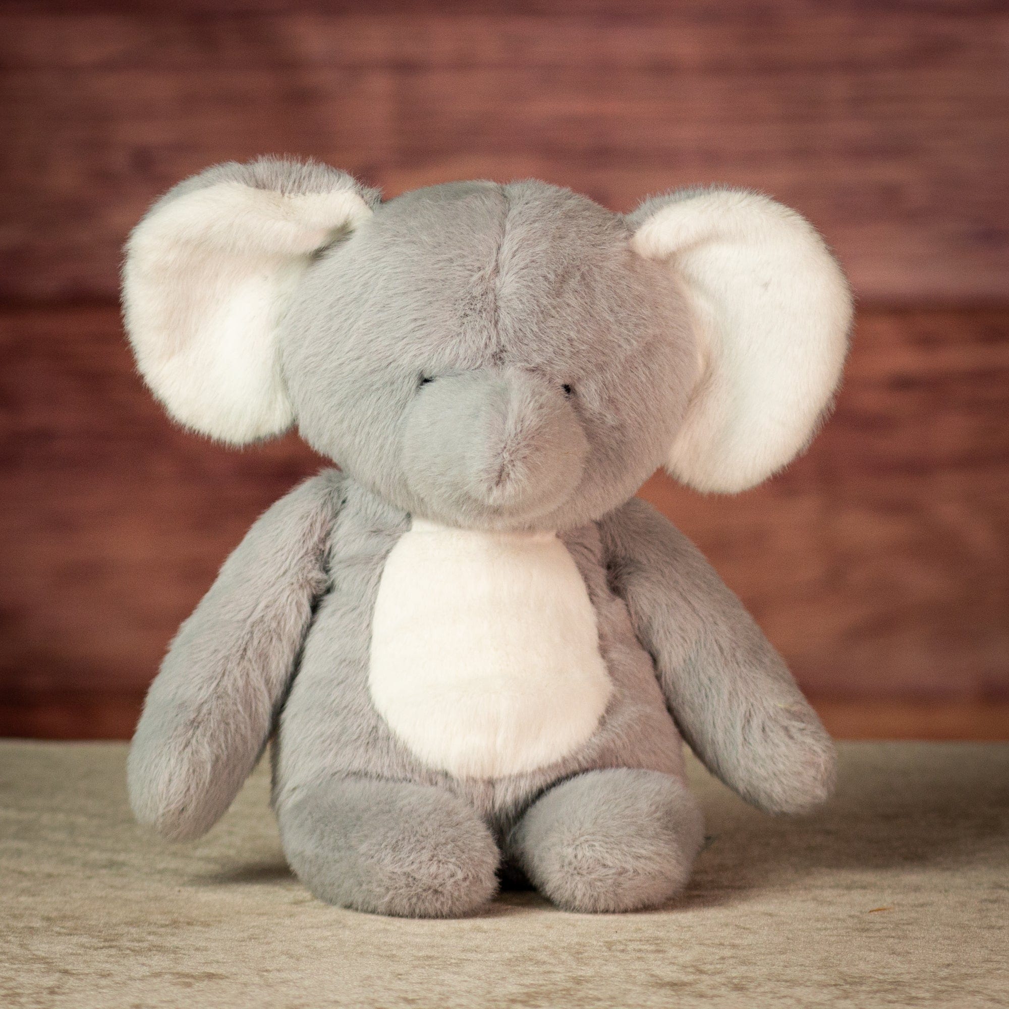 This 13" cuddle-position elephant is soft enough to snuggle and stands out with oversized ivory ears and a creamy white belly. Crafted in gentle gray, it's a plush pick from our everyday line��great for gift baskets, nursery displays, or as a neutral animal friend to anchor a safari-themed assortment. Its huggable shape and minimal facial details offer a modern, minimalist look that fits right into boutique-style settings.