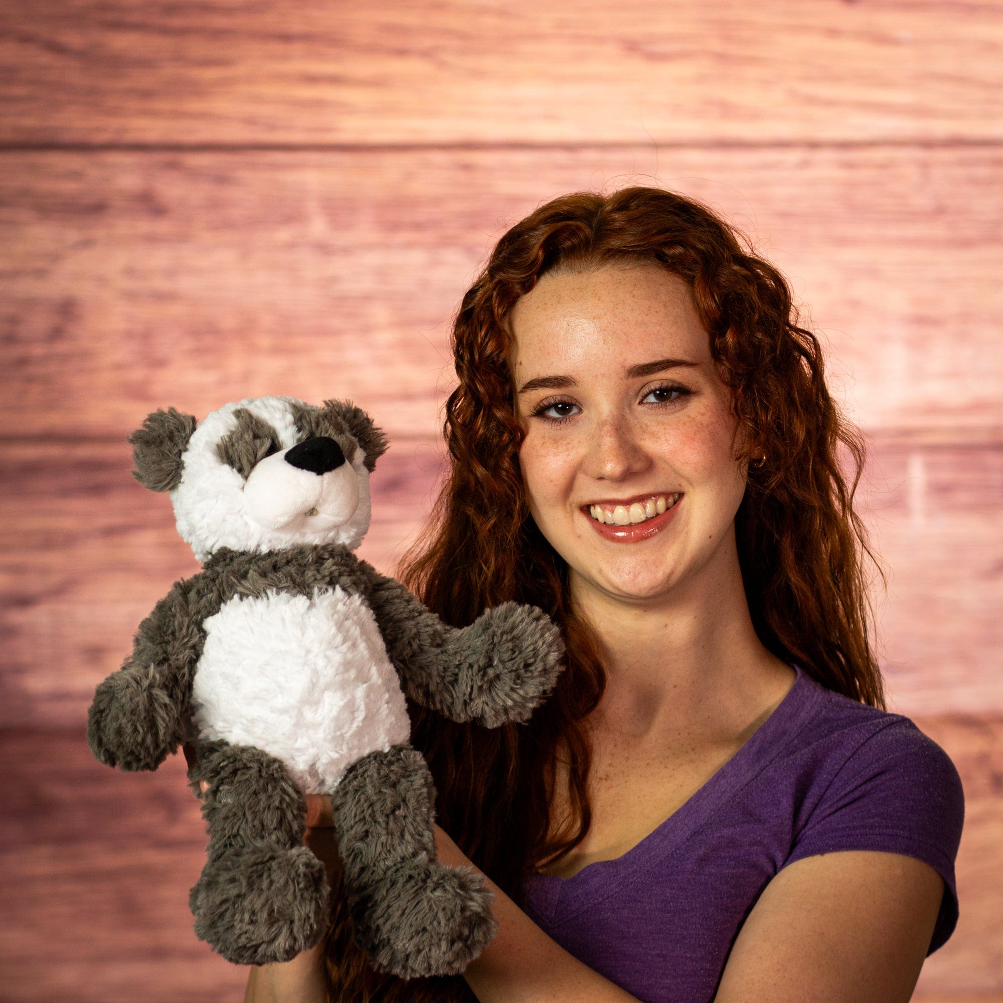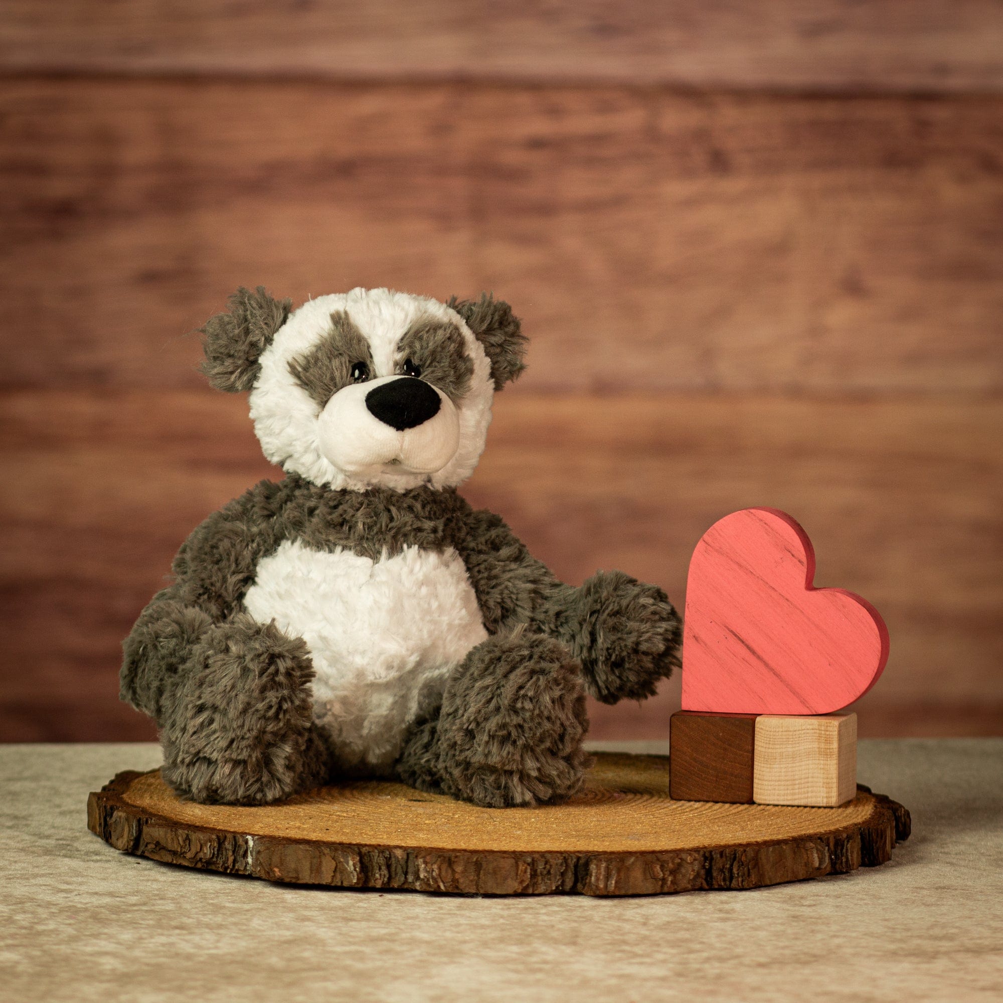 This 14" cuddle panda features shaggy gray and white fur, a relaxed beanbag-style body, and a plush oversized nose. With a slouchy shape and soft texture, it��s great for cuddling, stacking in sales bins, or adding to panda or woodland-themed displays.