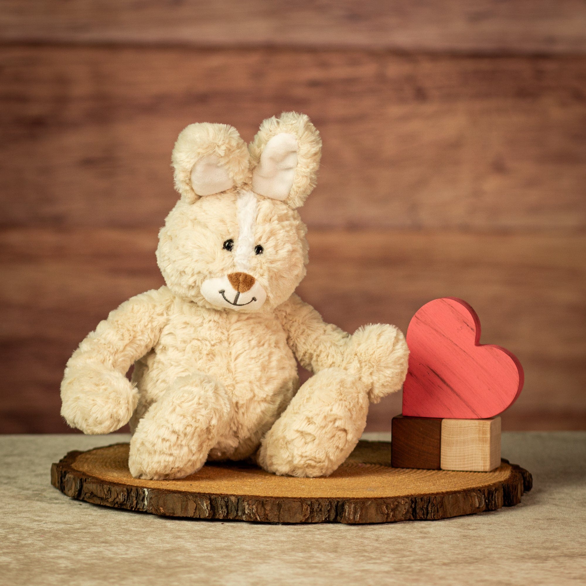 This 14" cuddle bunny features soft cream shaggy fur, long floppy ears, and a stitched smile. Its floppy limbs and lightly stuffed body make it perfect for spring displays, Easter baskets, or year-round cuddles. Sweet, simple, and soft all over.