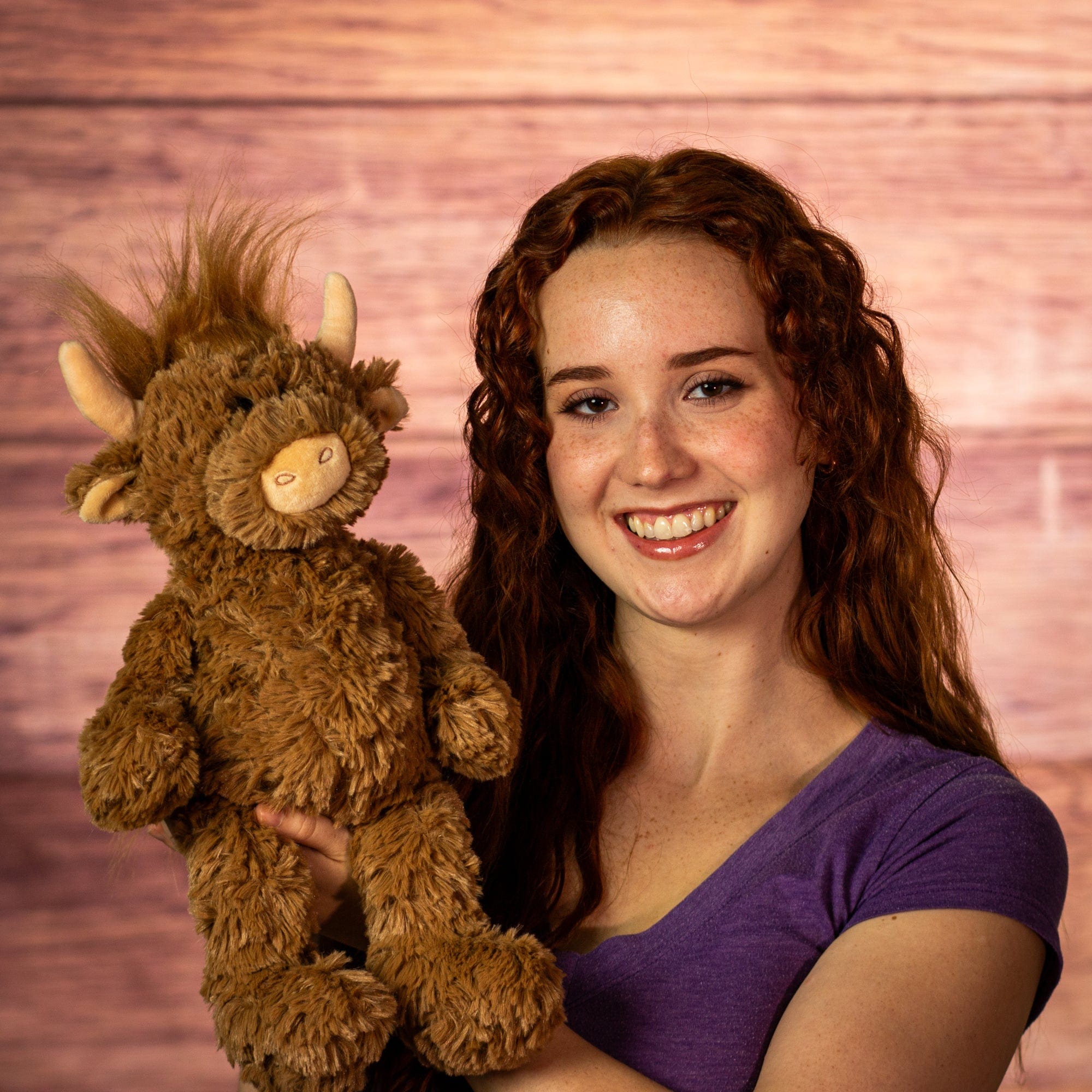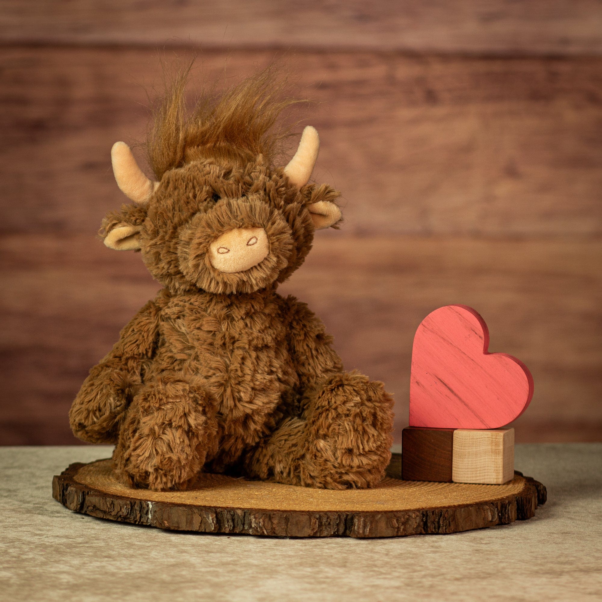 This 14" cuddle Highland cow stands tall with shaggy brown fur, soft plush horns, and a fluffy tuft of hair that gives it rustic charm. Its floppy limbs and lightly stuffed body make it perfect for farm displays, gift baskets, or cozy shop corners.