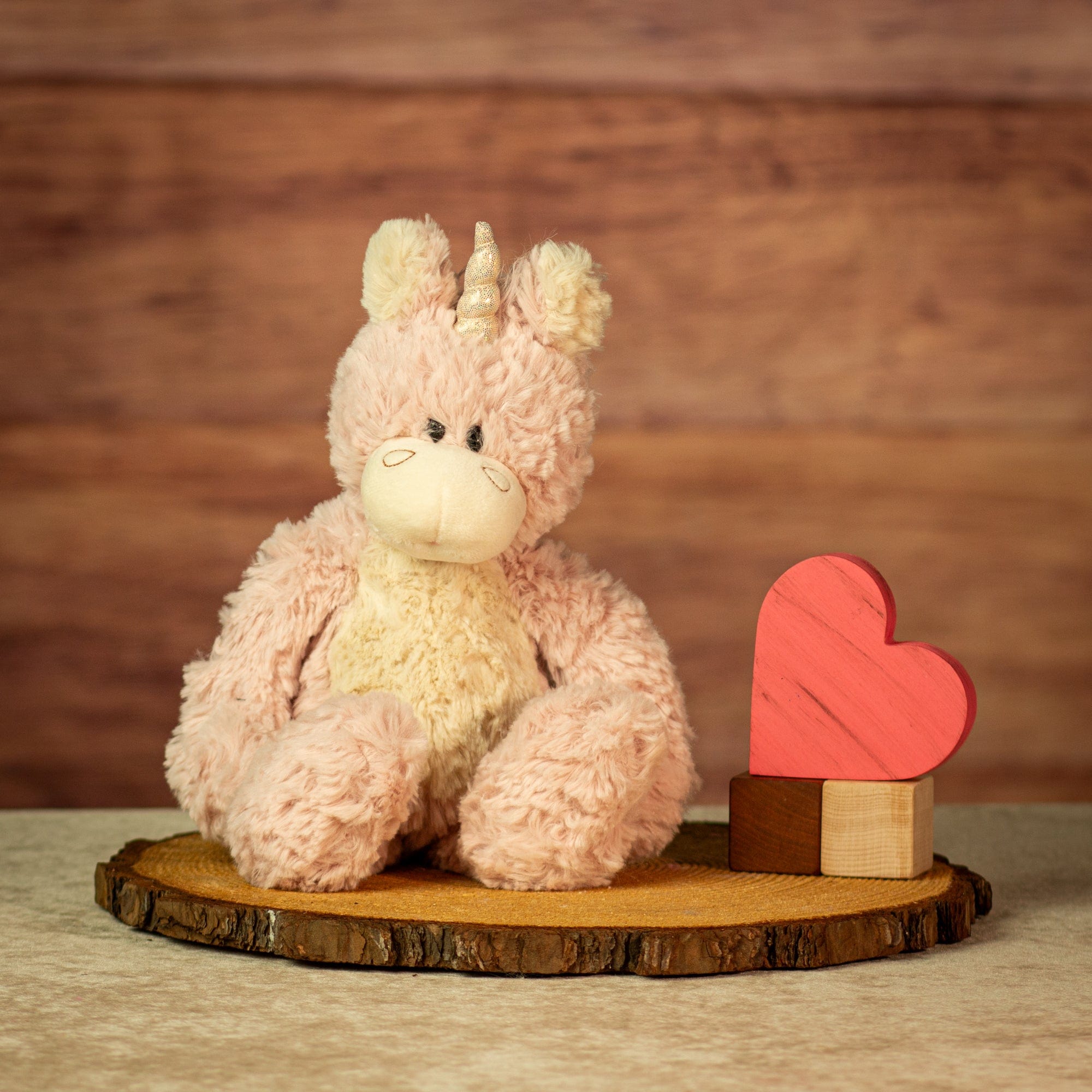 This 14" standing unicorn features shaggy pale pink fur, a soft cream belly, and a metallic gold horn. With a floppy body and gently weighted feet, it��s perfect for dreamy displays, gift baskets, or magical-themed shelves. A cozy choice with a touch of sparkle.