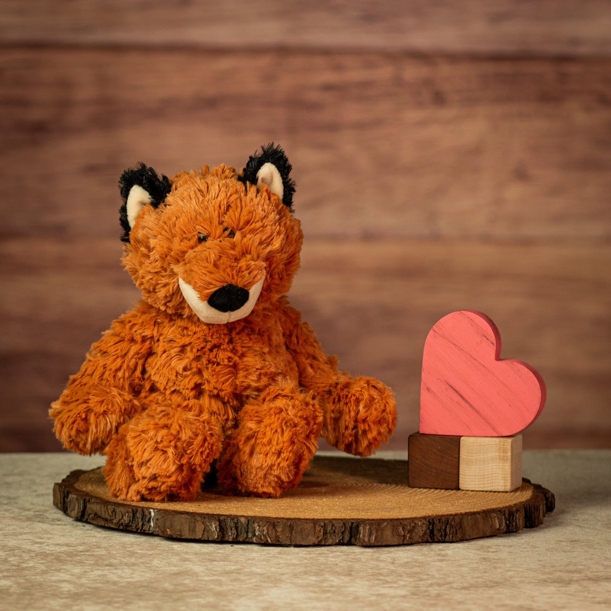 This 14" cuddle fox features rusty orange shaggy fur, black-tipped ears, and a cream snout. Lightly stuffed with a floppy body, it's soft enough to snuggle and sturdy enough to display. A charming pick for woodland themes or everyday gifting.
