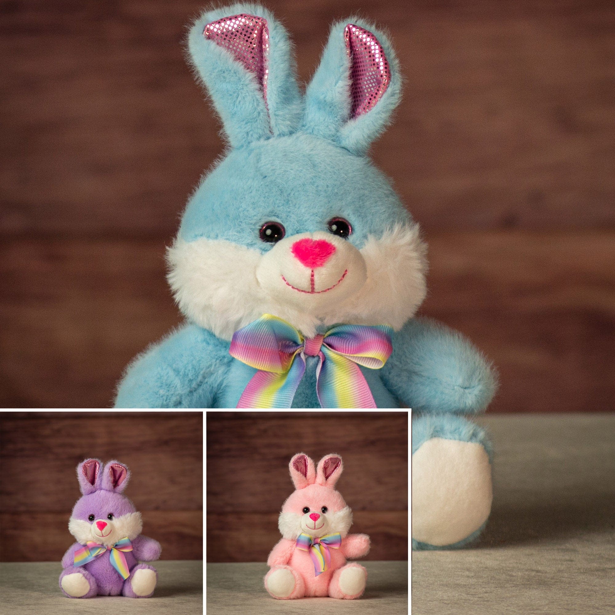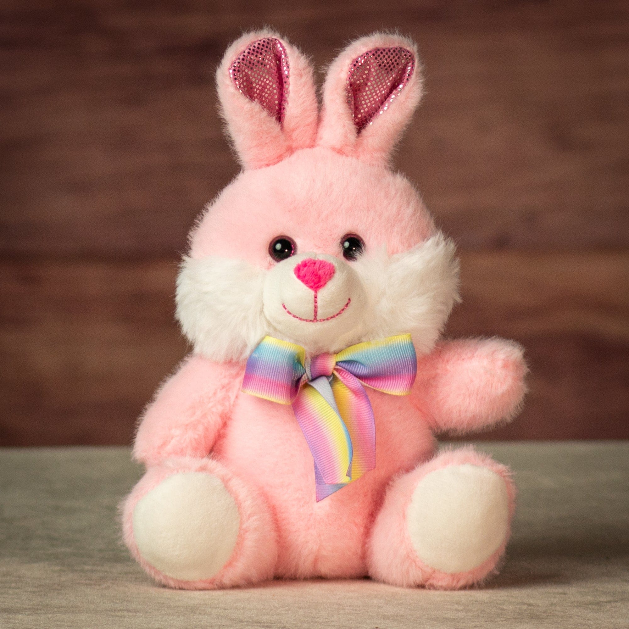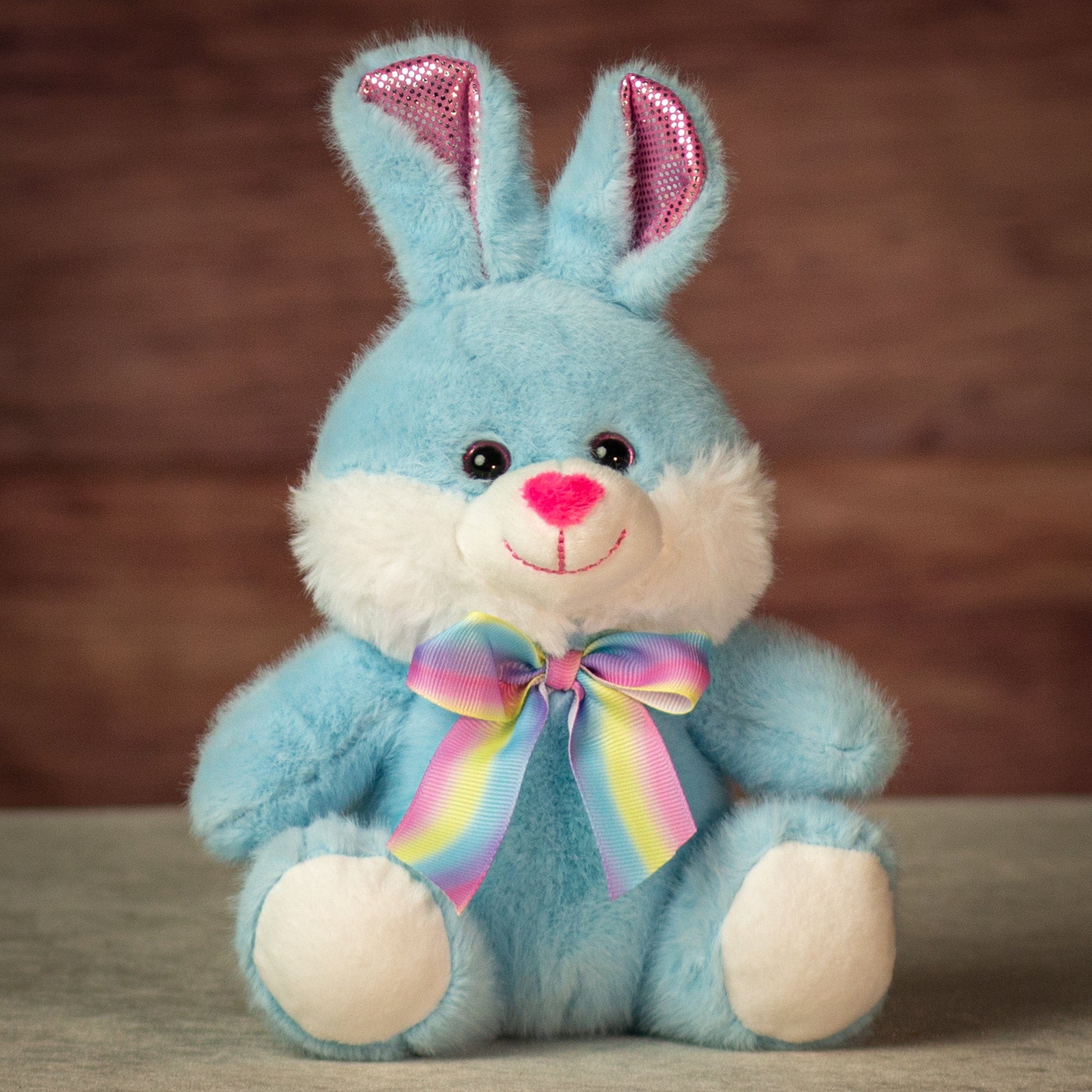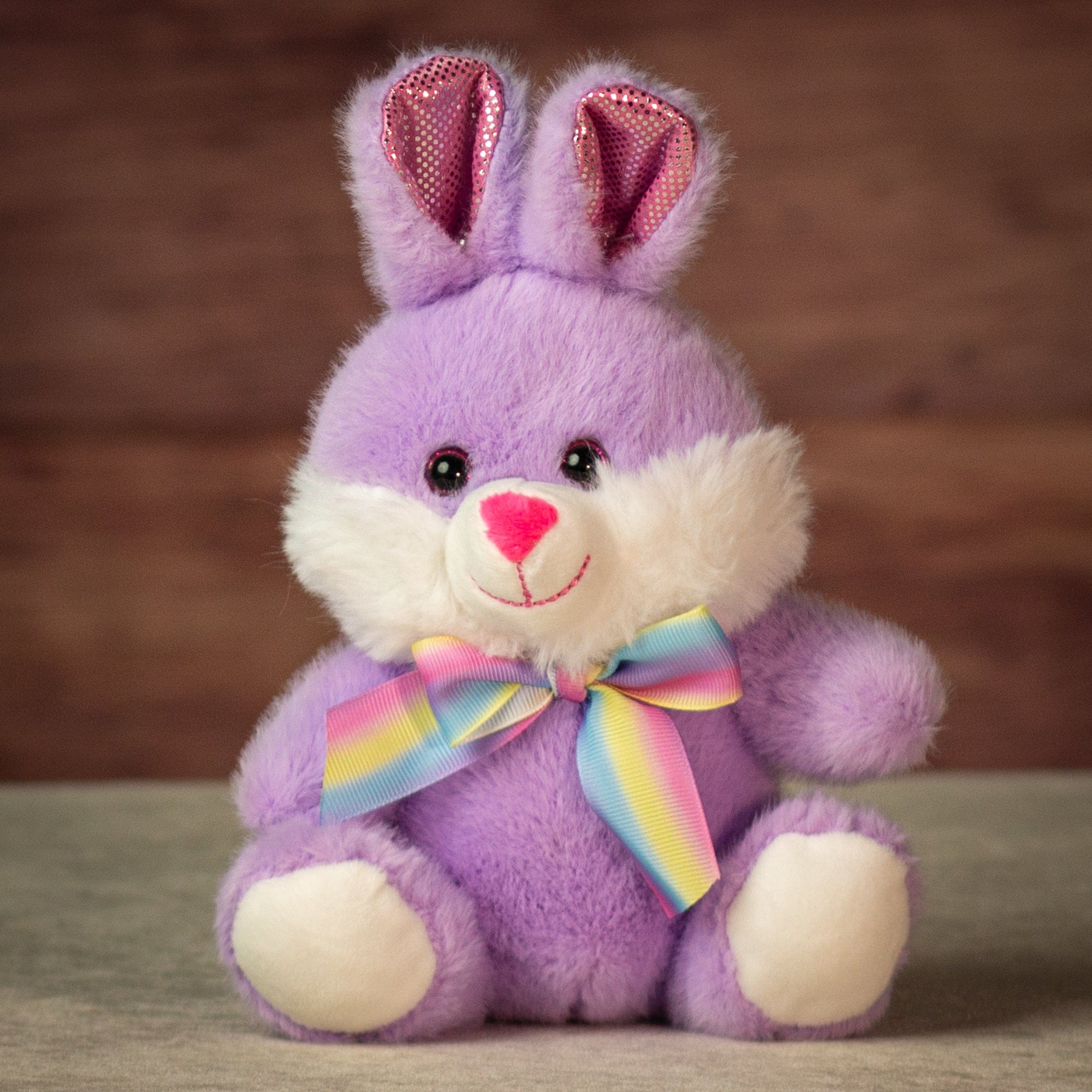 This 7" sitting bunny is sold equally assorted in packs of 12, with three of each color: blue, pink and purple. Each bunny features soft plush fur, a white muzzle and paws, bright pink nose, and shimmering pink inner ears for a subtle pop. The rainbow ribbon bow adds cheerful shelf appeal and makes each piece feel ready to gift. A great spring and Easter display item that works beautifully in flower shops, candy stores, and boutique gift sections. Compact size makes it easy to merchandise near registers or pair with seasonal baskets.